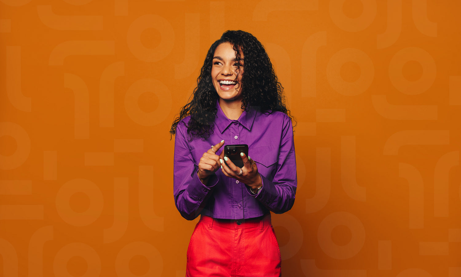Vibrant woman smiling and browsing on a mobile phone against a cheerful orange background