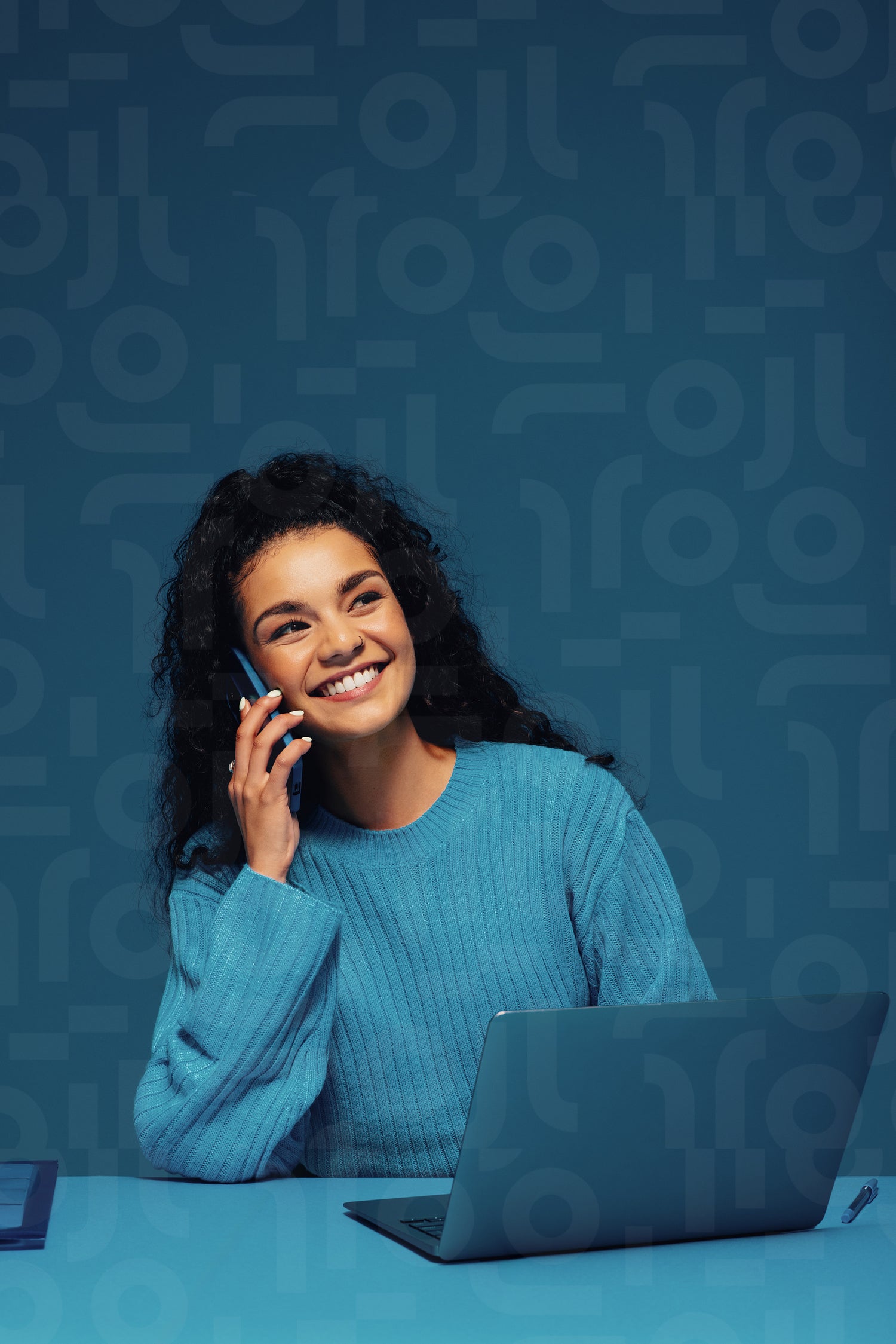 Smiling young business woman engaged in communication on her smartphone while working on her laptop in a blue monochromatic studio environment.