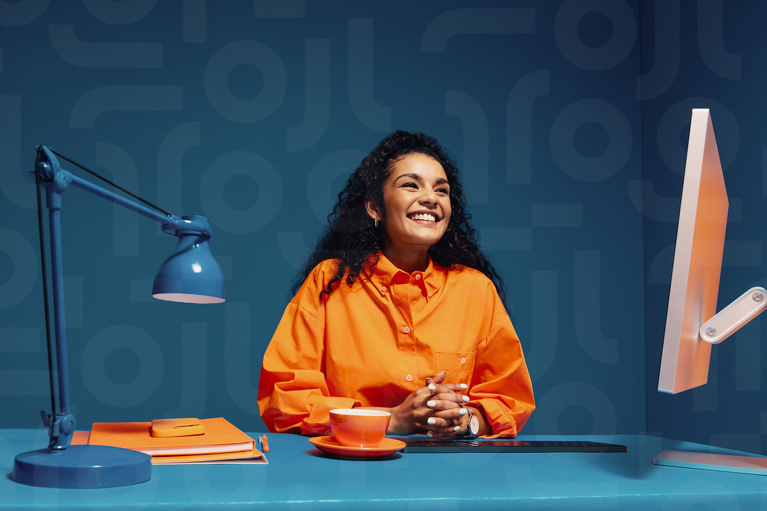 Young woman smiling at her desk in a colorful office setting, wearing a bright contrasting orange shirt, with hands clasped and surrounded by color blocking elements.