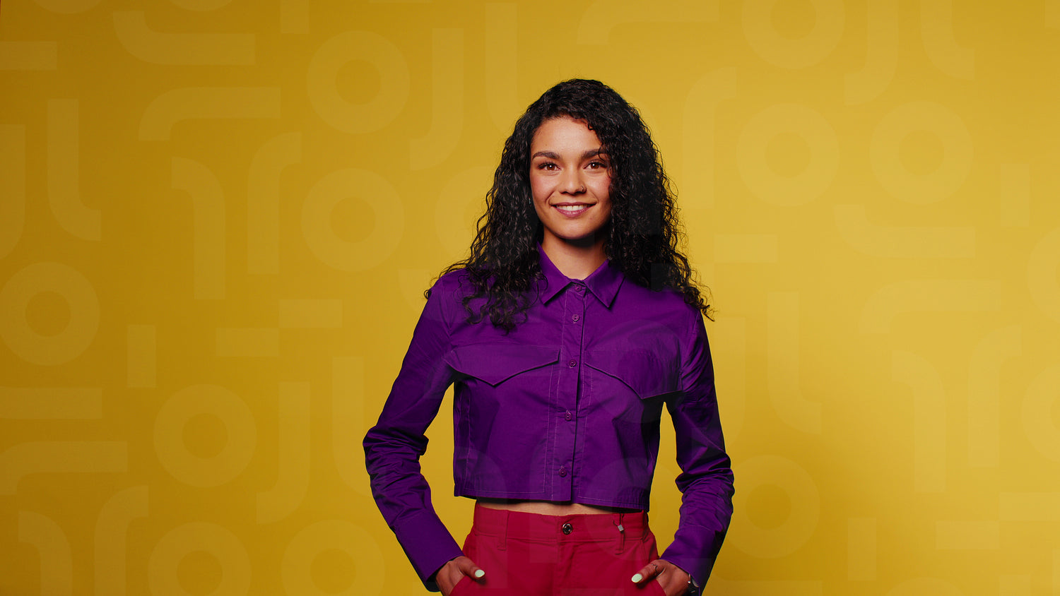 Young woman with curly hair smiles and poses on a yellow background in medium shot. She wears a purple shirt and red pants.