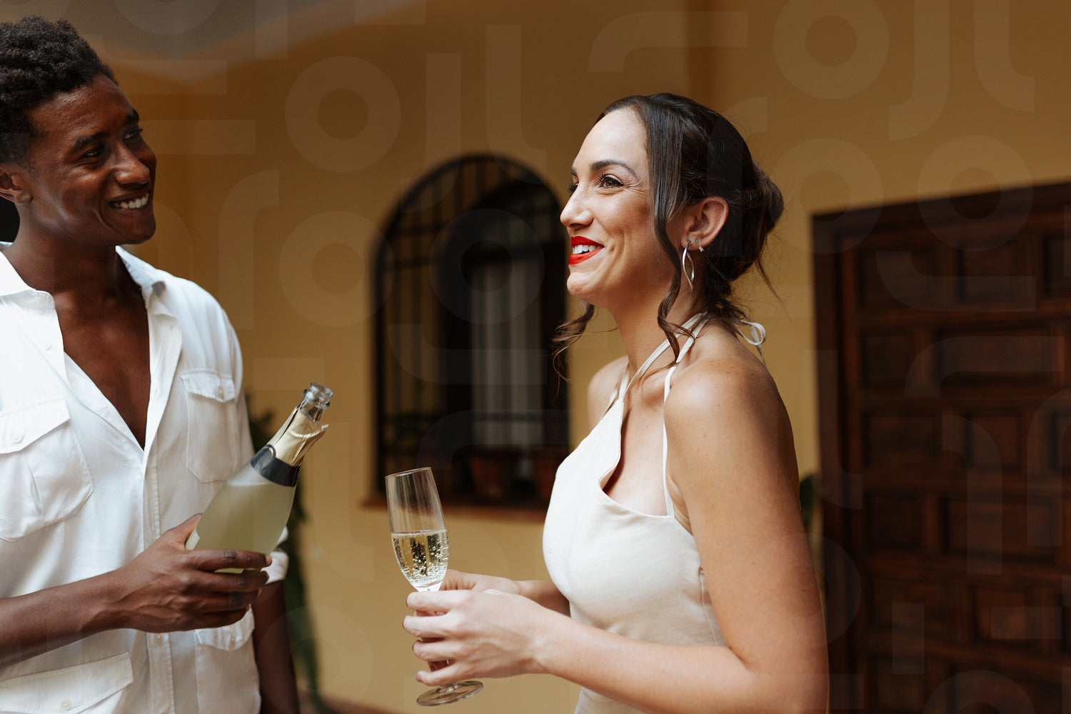 Cheerful couple pouring sparkling wine into a drinking glass. Romantic young couple celebrating their dating anniversary at home. Happy interracial couple having a good time on their porch.