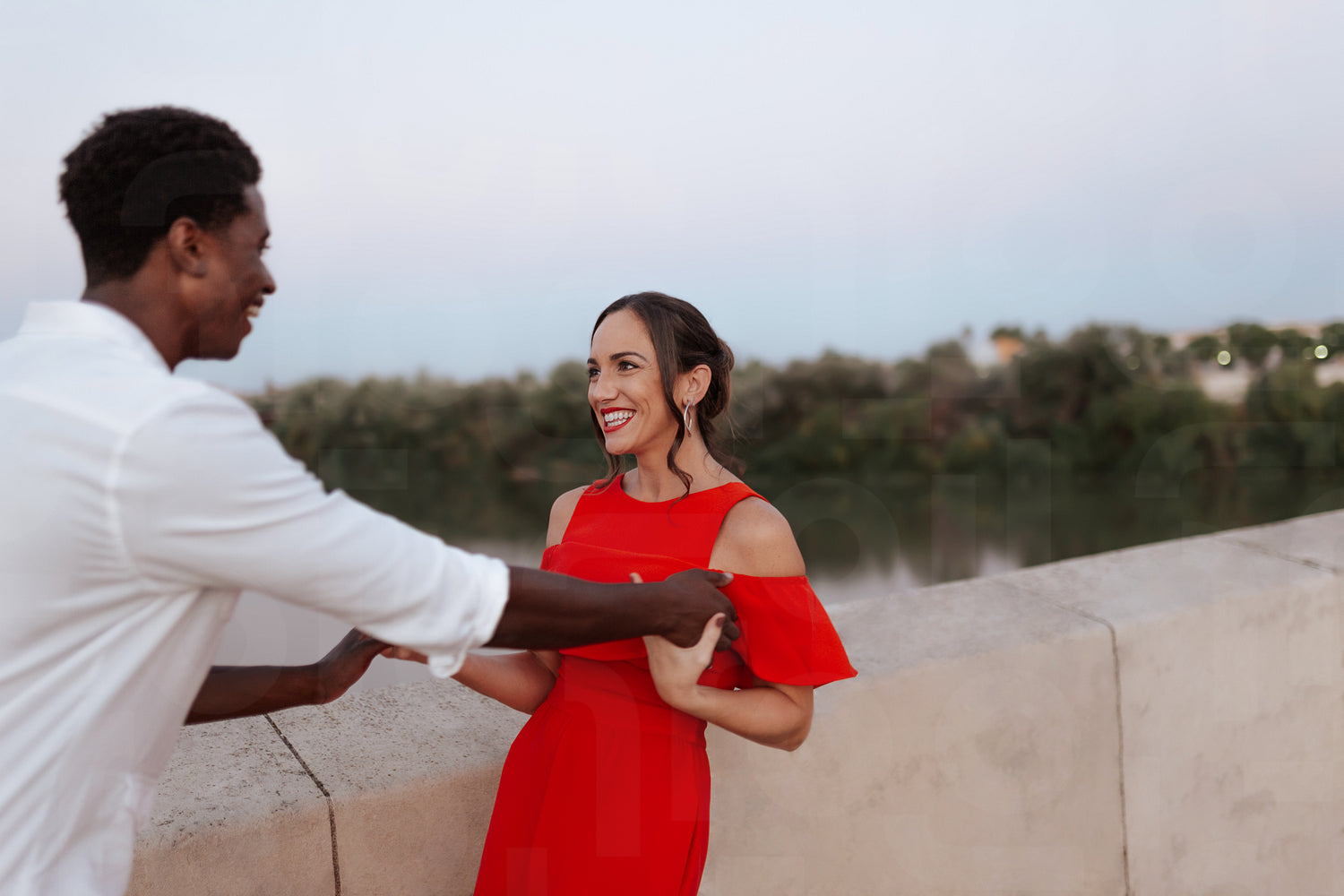 Couple dancing cheerfully while standing on a bridge. Happy interracial couple sharing a fun and romantic moment together. Affectionate young couple enjoying their vacation.