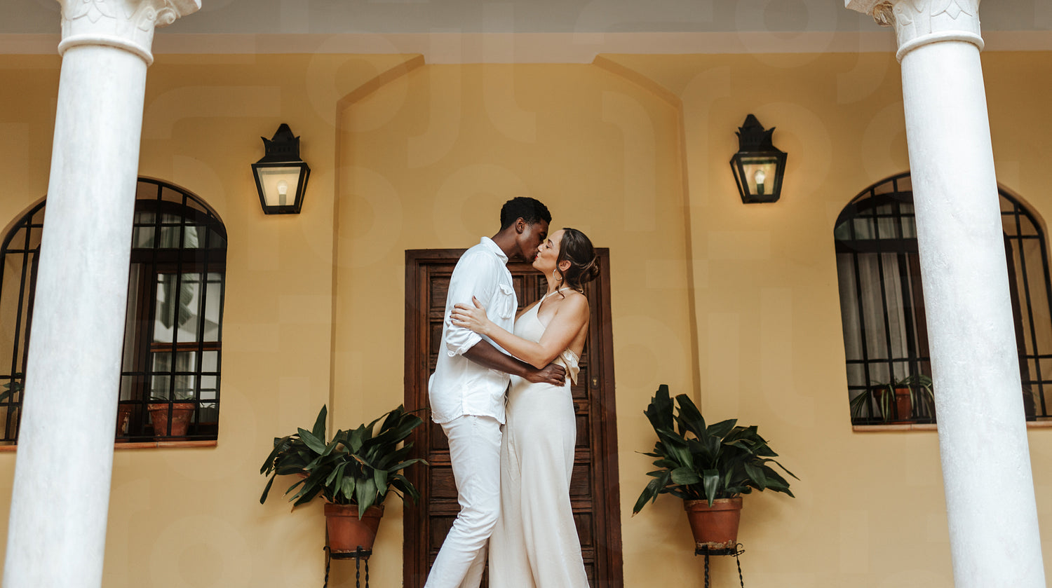 Young couple kissing affectionately while standing on a porch. Young interracial couple sharing an intimate moment at a holiday home. Romantic young couple enjoying their weekend together.