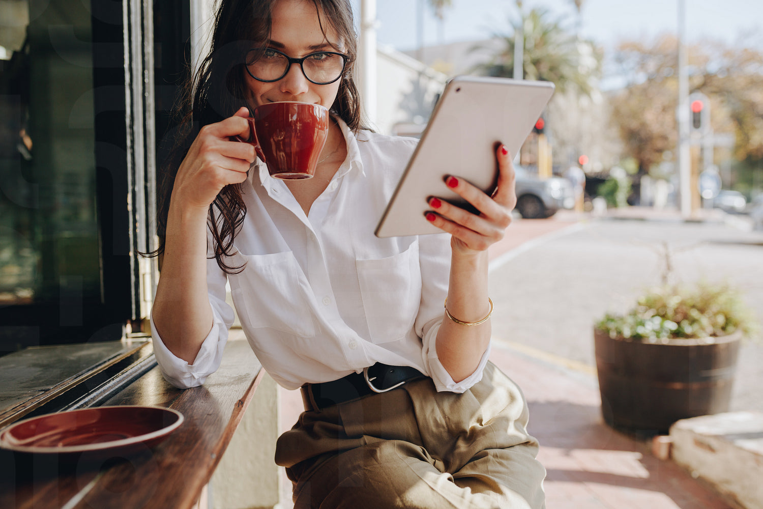 Female wearing glasses at cafe with a digital tablet drinking coffee. Businesswoman drinking coffee at cafe.