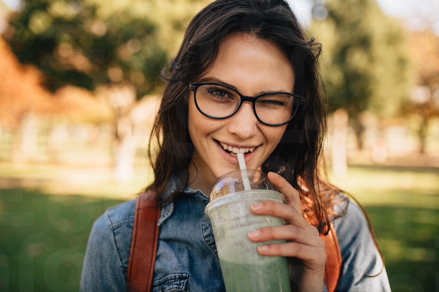 Cheerful woman at park drinking juice and winking. Woman in eyeglasses drinking smoothie and winking an eye.