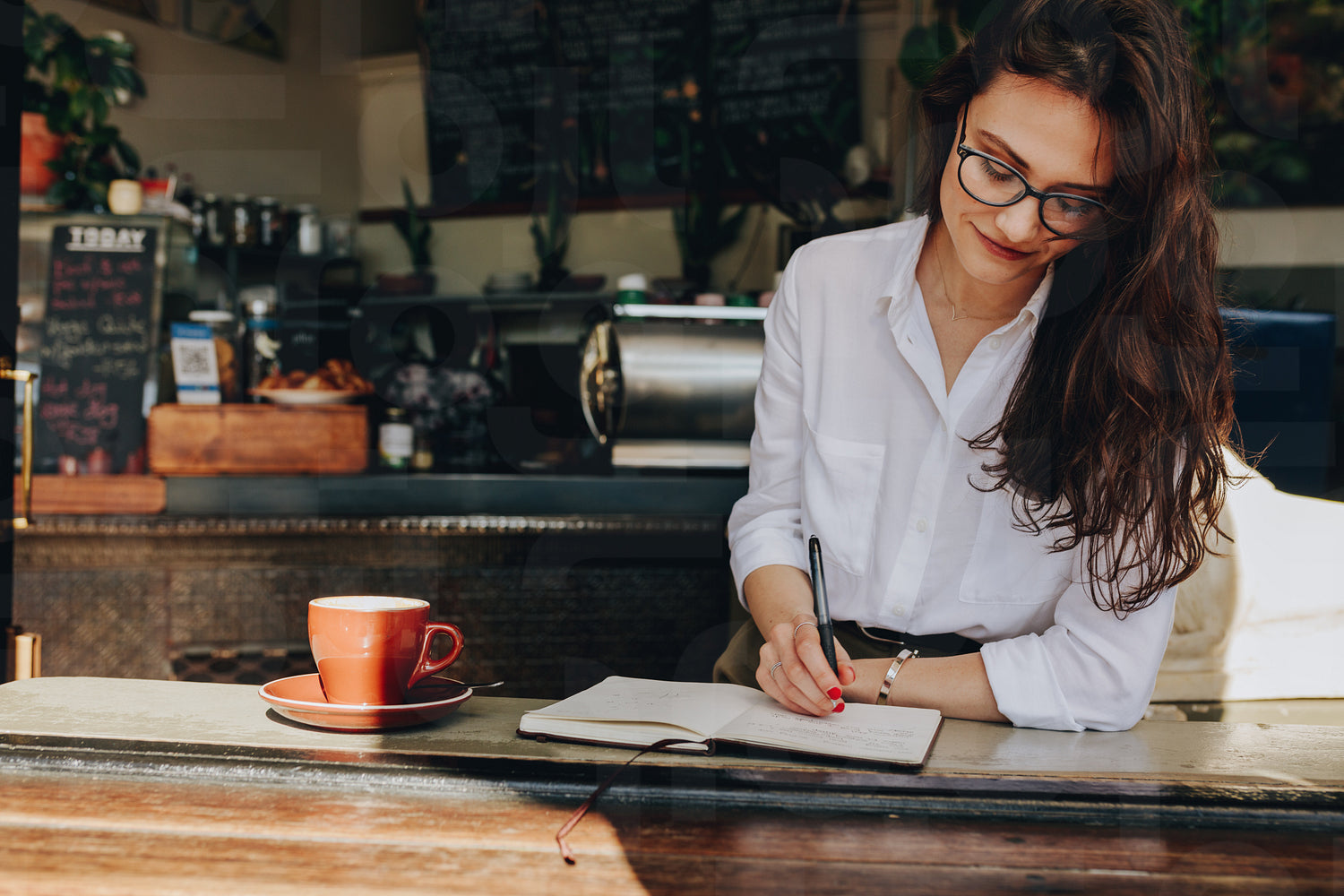 Happy young woman sitting in the cafe writing notes in her diary. Female making notes in her book while relaxing at coffee shop.