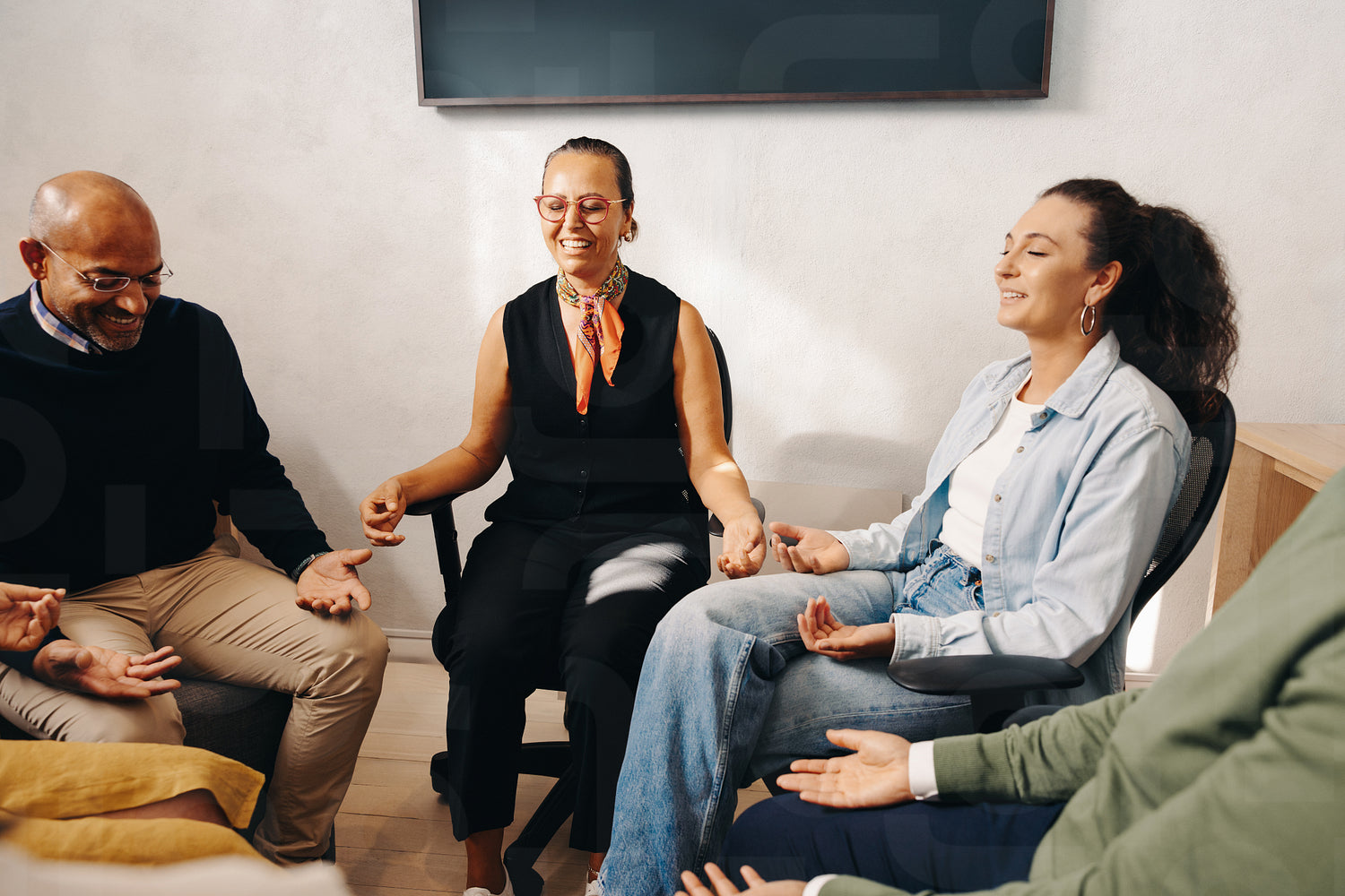 Group of colleagues meditating together for relaxation during a workplace exercise