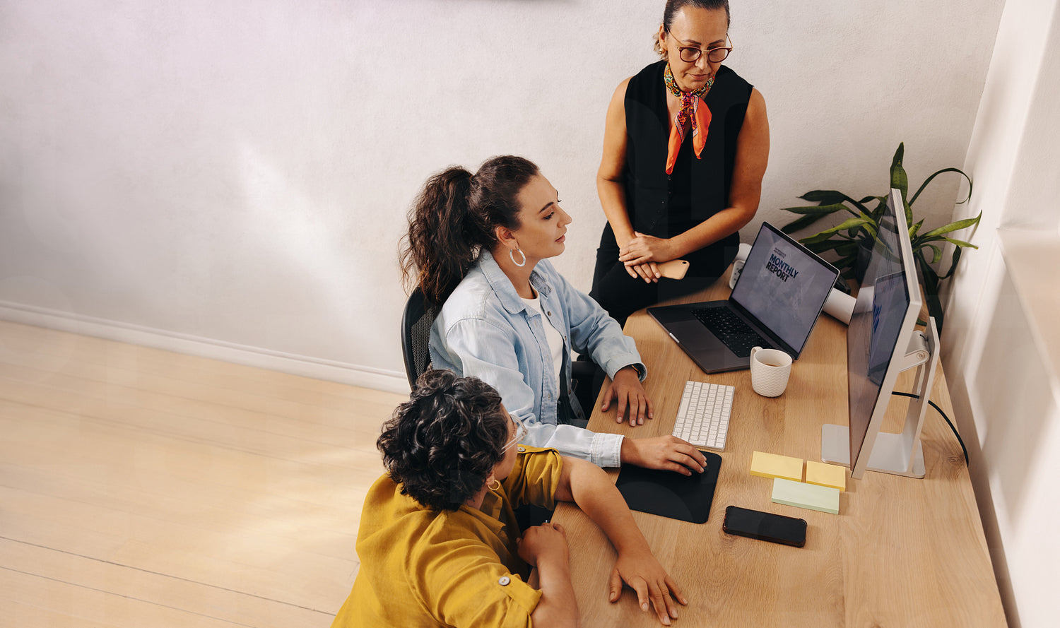 Colleagues in a bright office share ideas, using computers and materials, emphasizing teamwork and collaboration in a professional setting with modern elements and copy space for customization.