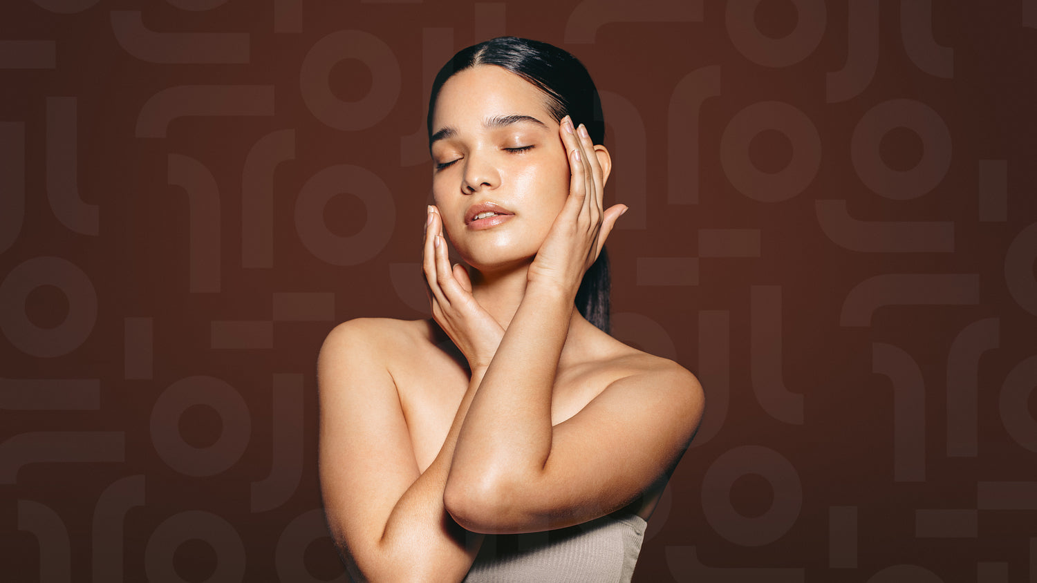 Beautiful young woman touching her flawless skin in a studio. Gorgeous Hispanic woman stands with her eyes closed in a studio, showing off her smooth and soft skin; the results of her skincare routine.