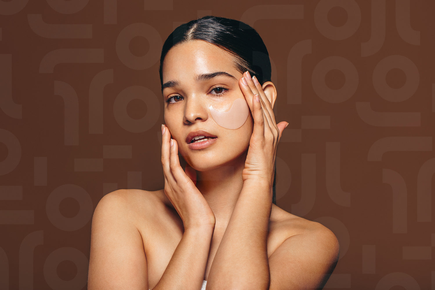 Female looking at the camera as she treats her under eyes with a cosmetic gel patch. She applies this anti-aging facial treatment to prevent dark circles and to have more radiant, beautiful skin.