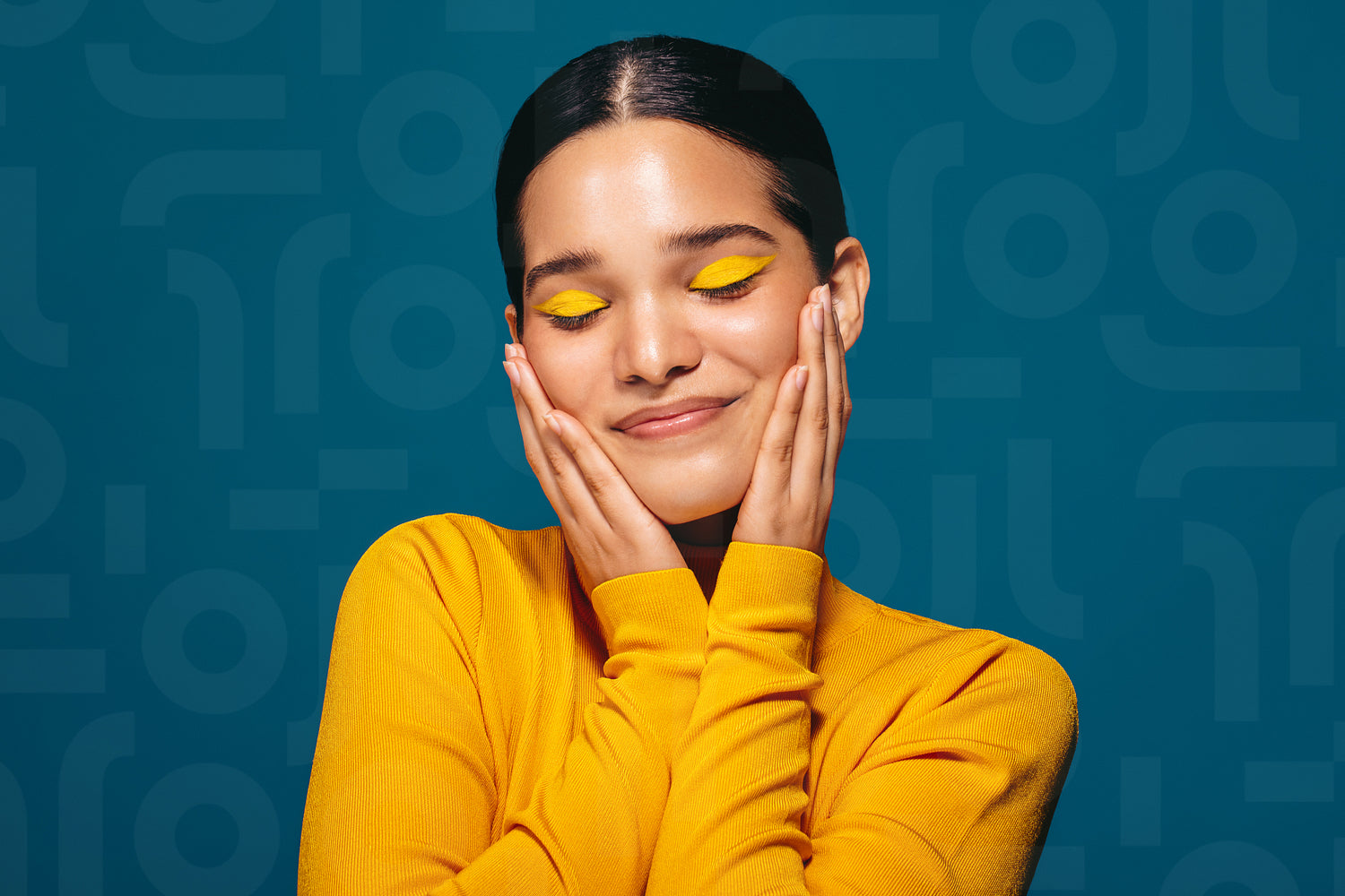 Female in her 20’s embracing her face with vibrant makeup on; expressing self-love and self-acceptance. Woman wearing graphic eyeshadow feeling empowered by her beautiful and radiant look.