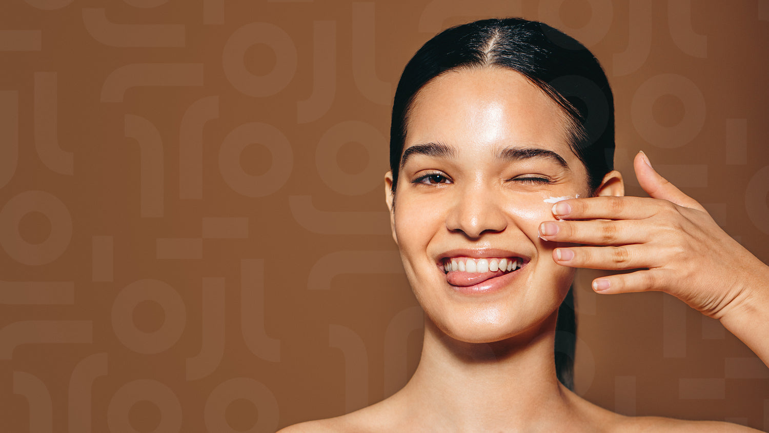 Woman in her 20’s applying moisturising cream on her face, her confident smile showing her satisfaction with this beauty product. Young female practicing self-care to achieve a healthier skin.