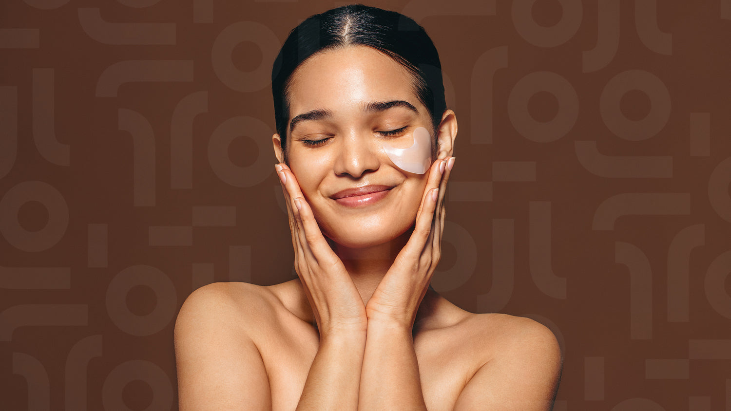 Woman with smooth skin enjoys using a hydrogel patch on her skin, an undereye mask used for anti-aging