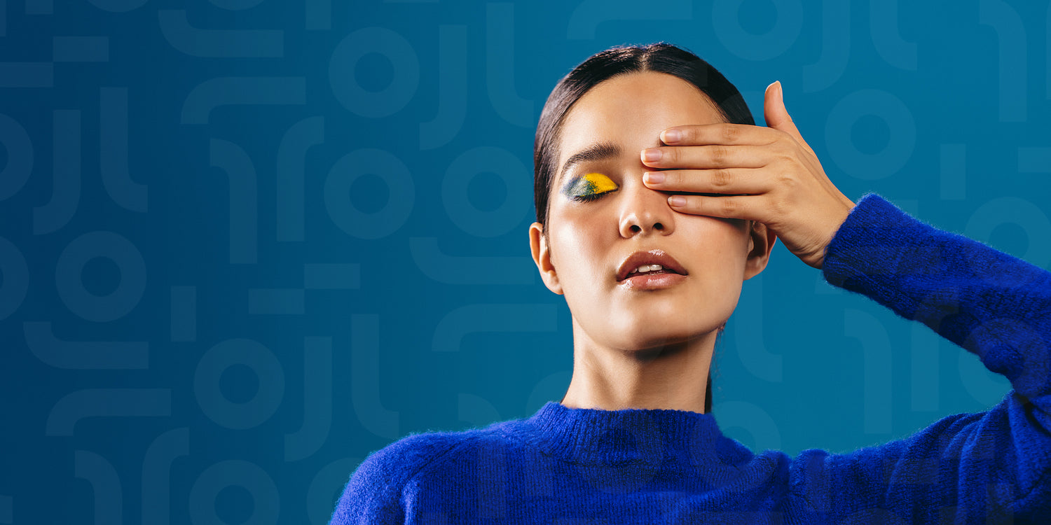 Woman in a blue sweater covers her eye to highlight her striking graphic eyeliner. Glamorous young woman wearing a bold eye makeup look in a studio.