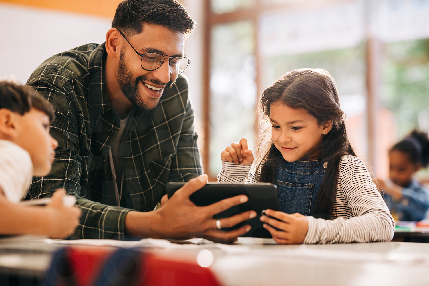 Coding and digital literacy in elementary school. Teacher gives a lesson using a digital tablet in a primary school class. Man teaching young children using technology.
