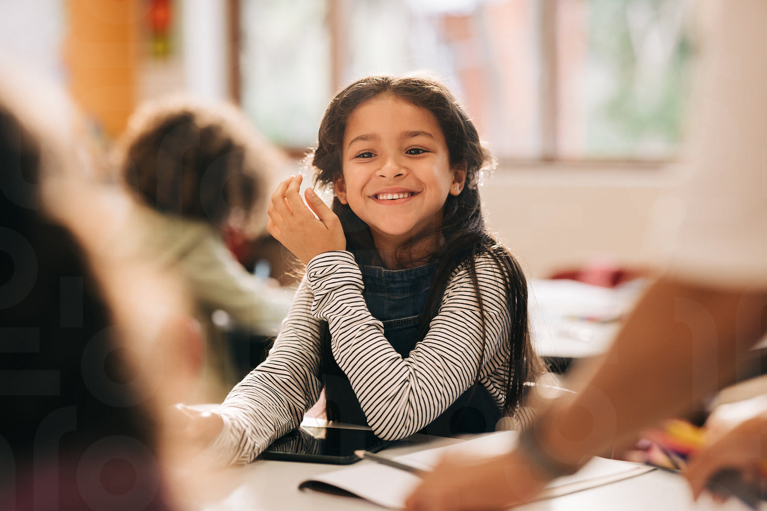 Happy little girl sitting in class, young student enjoying elementary school. Child attending a creativity class in a co-ed school.