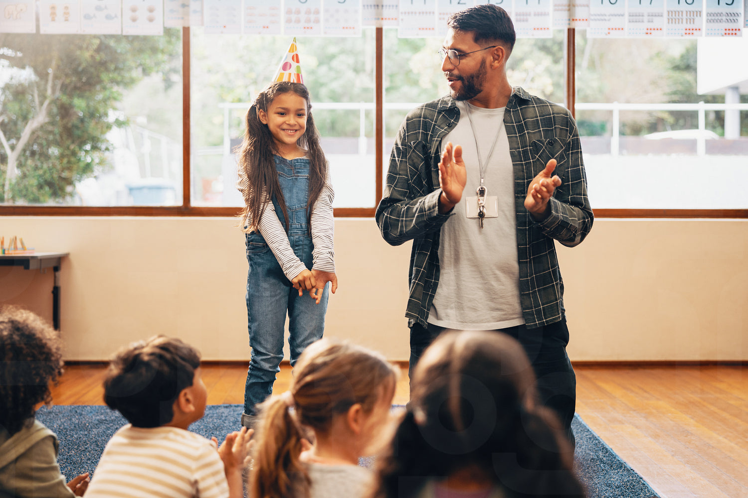 Primary school birthday celebration. Girl wearing a cone hat and standing in front of her class on her birthday. Female student celebrating her birthday with her teacher classmates in an elementary school.