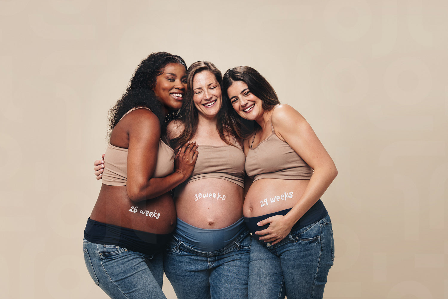 Expecting mothers standing together in a studio, hugging and supporting each other during pregnancy. Diverse women smiling, and celebrating their baby bumps in comfortable maternity jeans and bras.