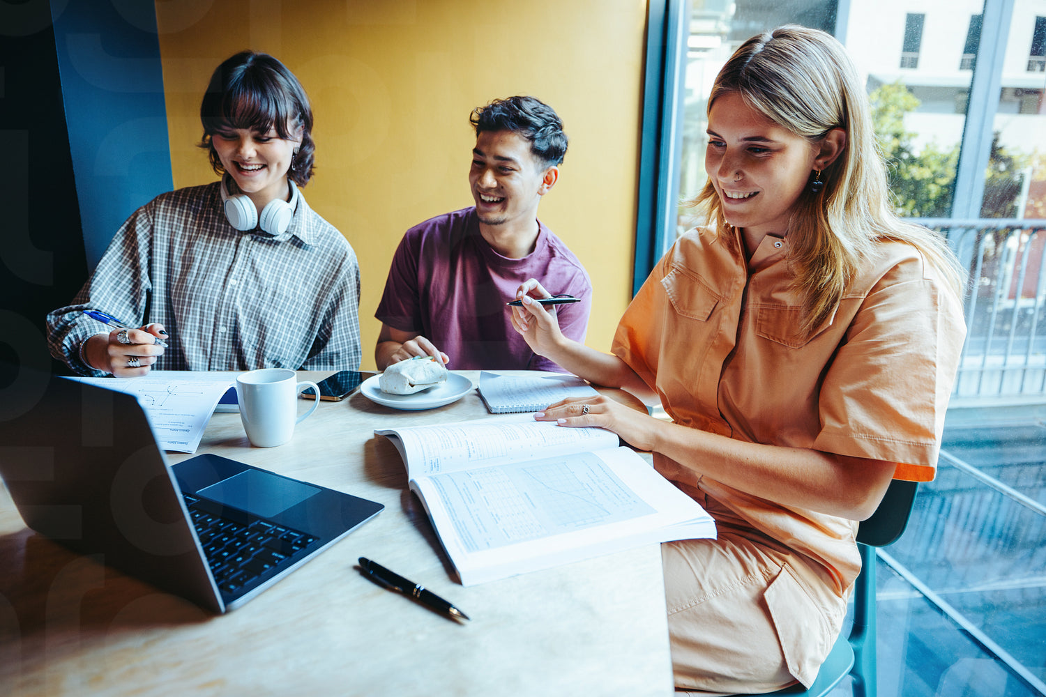 College classmates engaging in a collaborative project. They study and share ideas in a modern setting with books and a laptop.