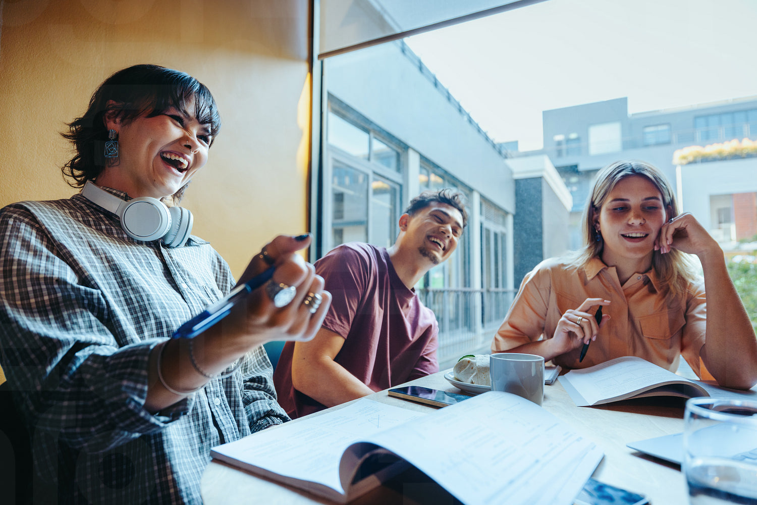 A group of college students laughing and learning together, highlighting fun and collaboration in a modern educational environment.