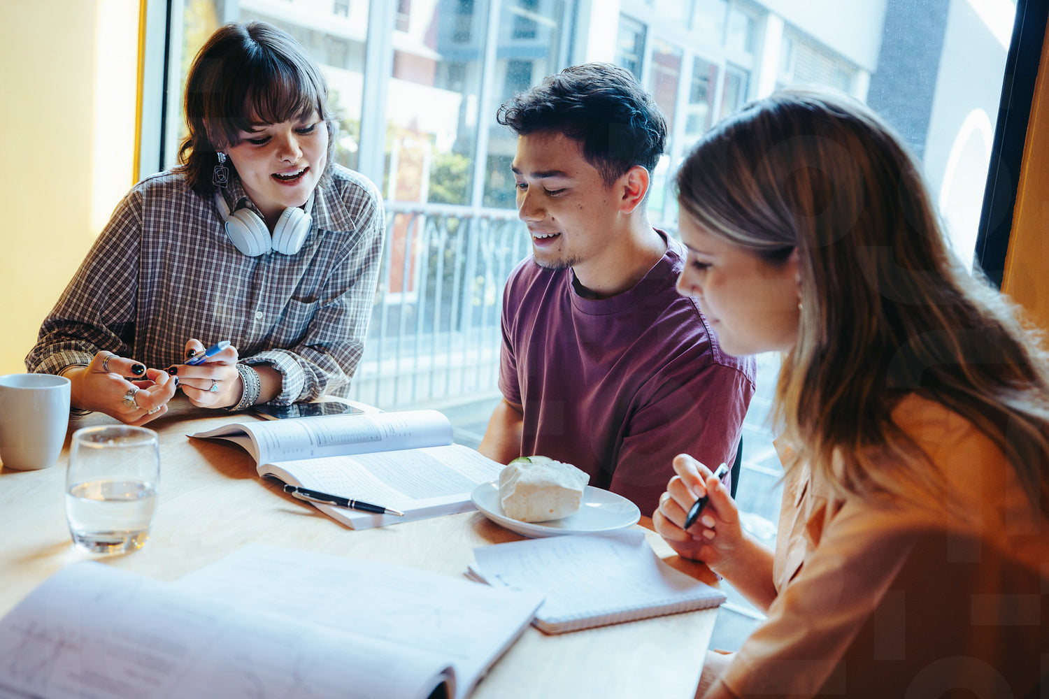 Group of classmates collaborating on homework at a cozy cafe, sharing ideas and working together