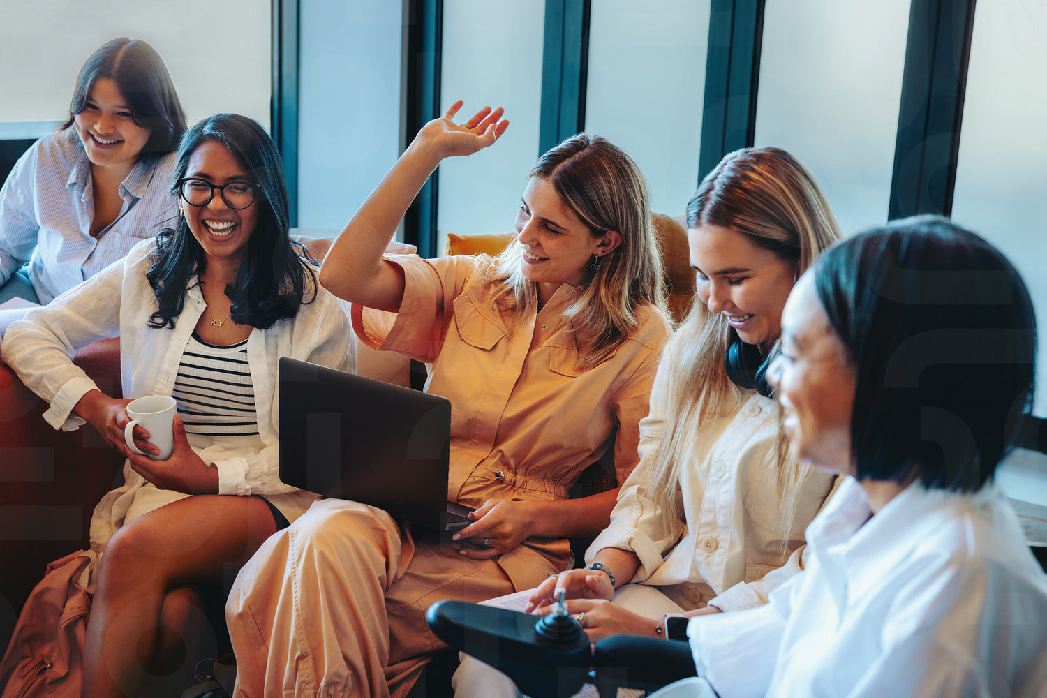 Group of female students in a casual study session with one student raising her hand, enjoying the informal learning environment