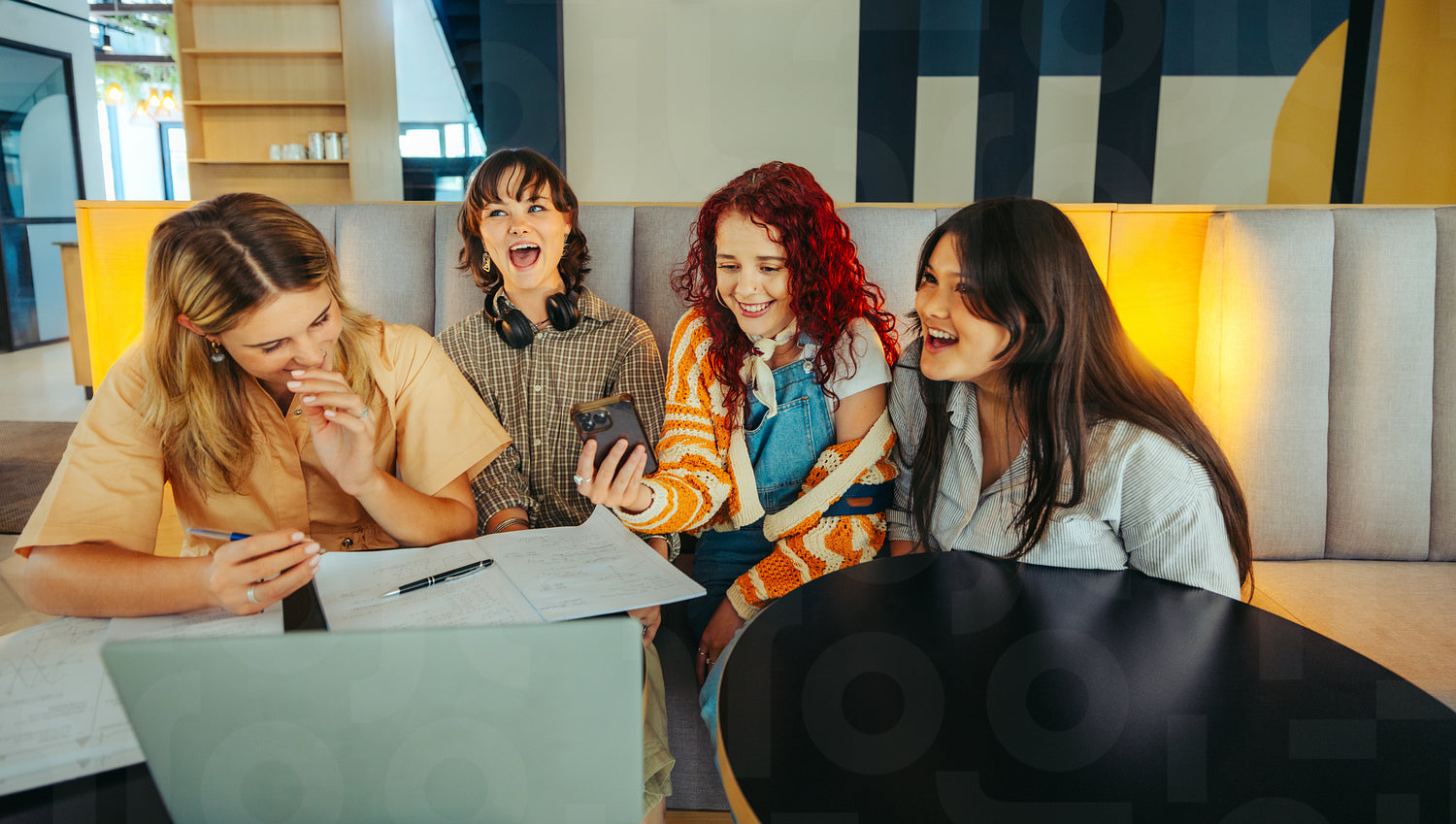Group of friends laughing together over a joke in a school library setting, surrounded by books and technology