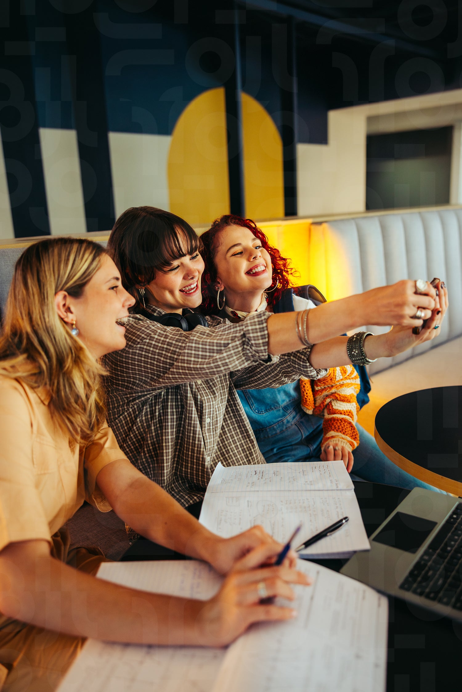Friends captured in a joyful selfie moment while studying at school. The group sits with notebooks and a laptop, reflecting fun and companionship.