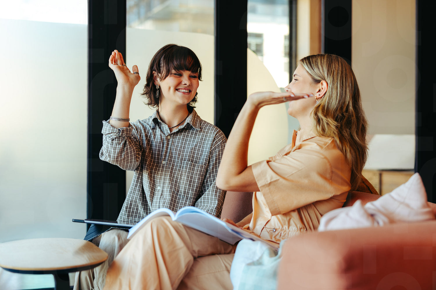 Two college students celebrating a completed assignment with a high five in a relaxed sitting area
