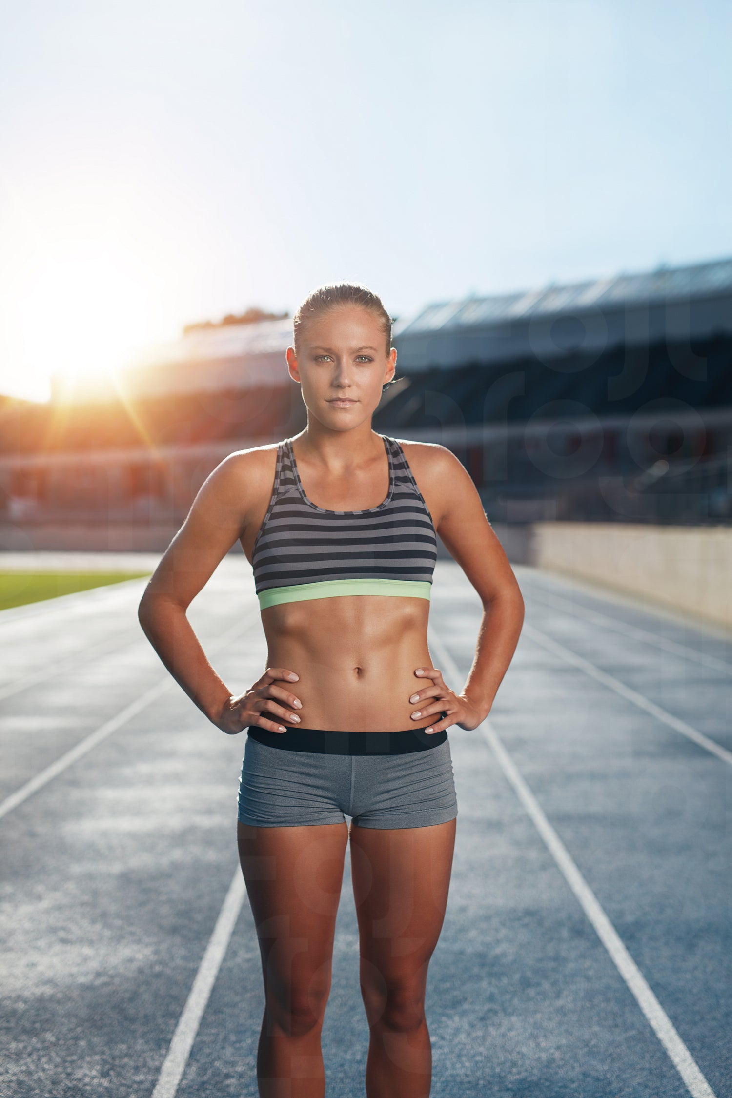 Fit young woman after run on stadium race track. Confident female athlete standing with her hands on hips looking at camera with sun flare.