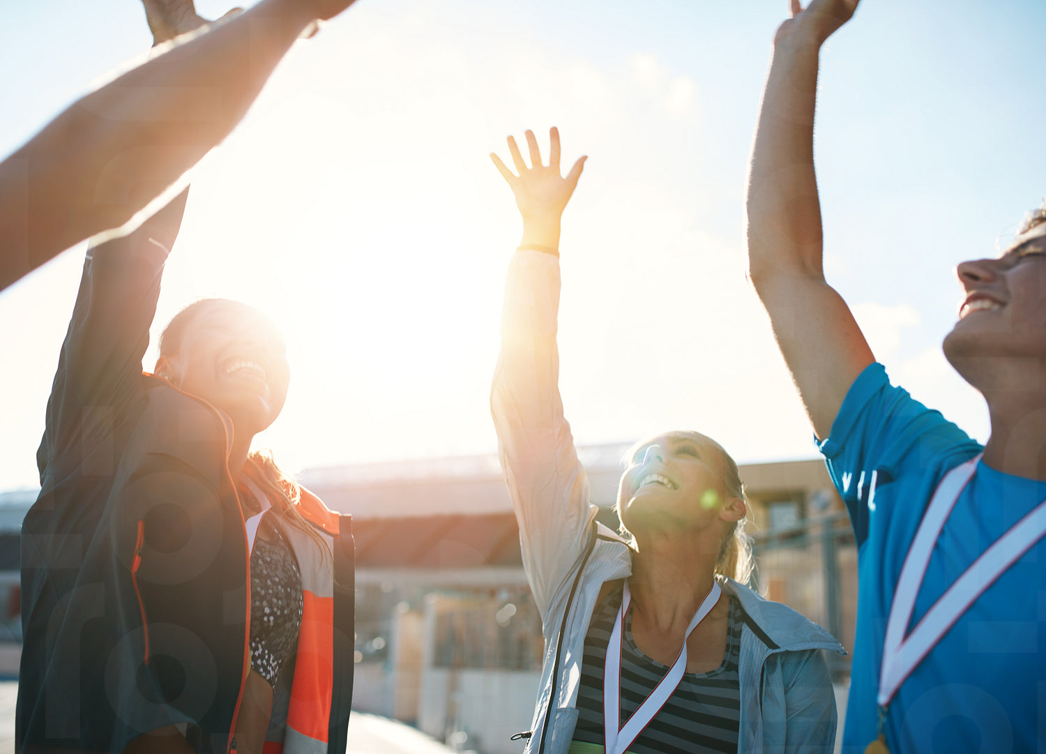 Group of young athletes celebrating success while standing in a huddle. Successful team of athletes cheering victory.