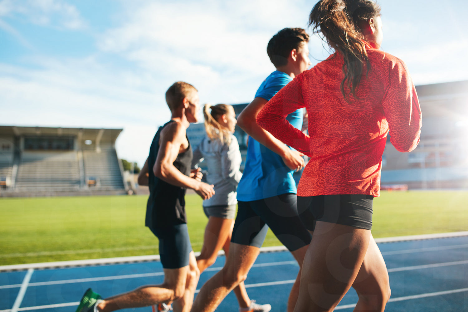 Young athletes running on race track in stadium