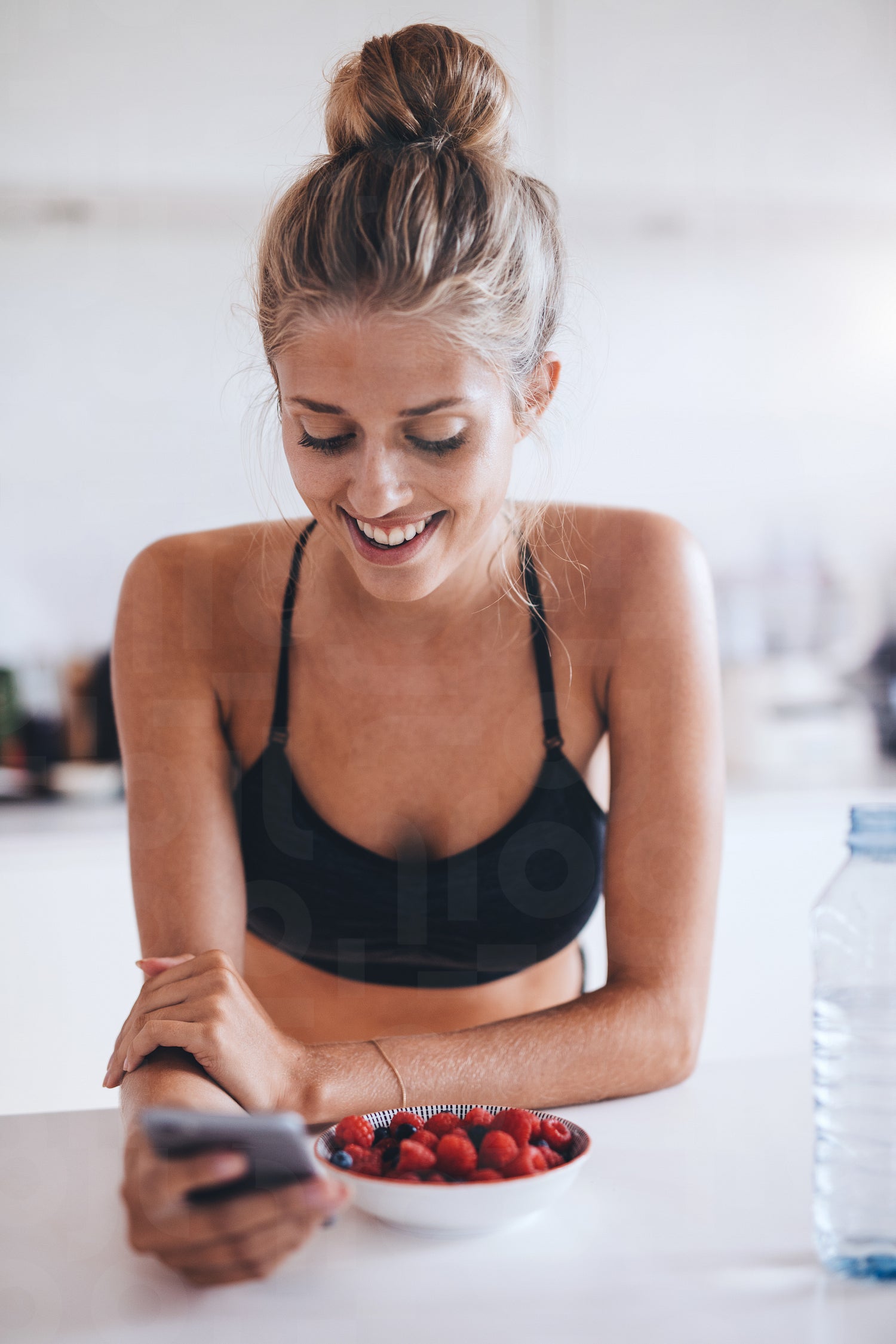 Beautiful young woman standing by kitchen counter with bowl of fresh berries and reading text message on her cell phone. Female social networking in morning on mobile phone.