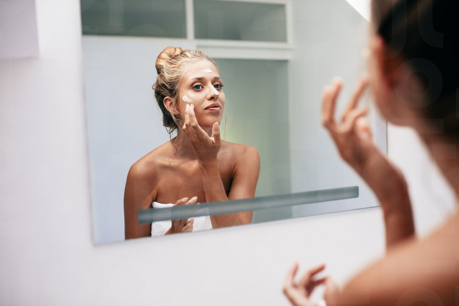 Young woman reflection in mirror applying cream in bathroom. Caucasian female doing beauty treatment on her face at home.
