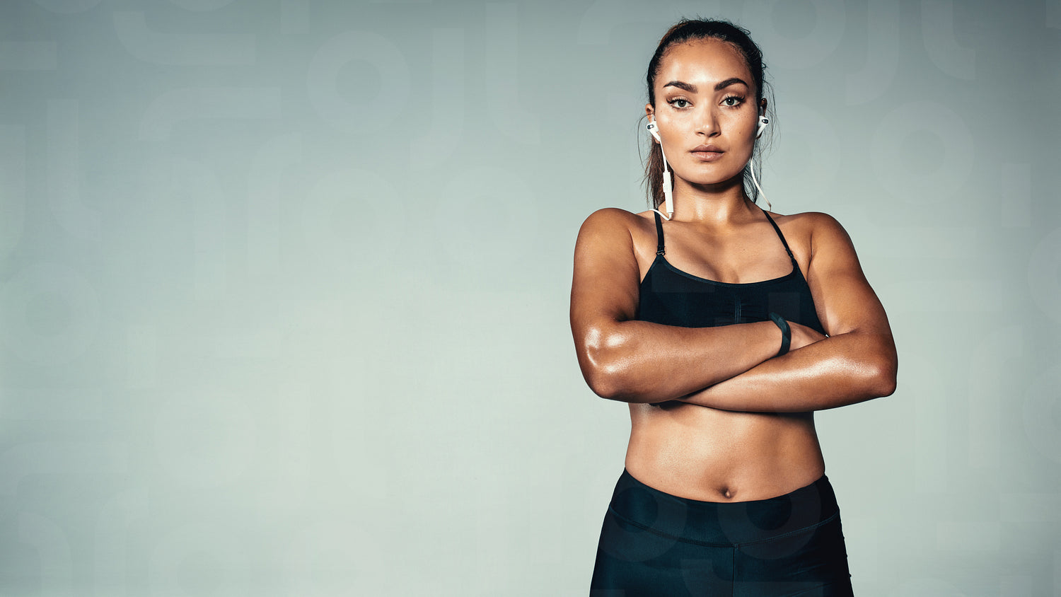 Portrait of fitness woman standing with her arms crossed. Female model in sportswear over grey background.