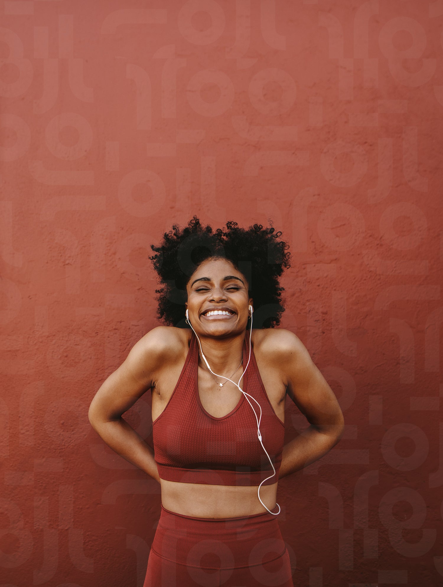 Healthy and fit woman standing by a wall and smiling. Female taking a rest after training session.