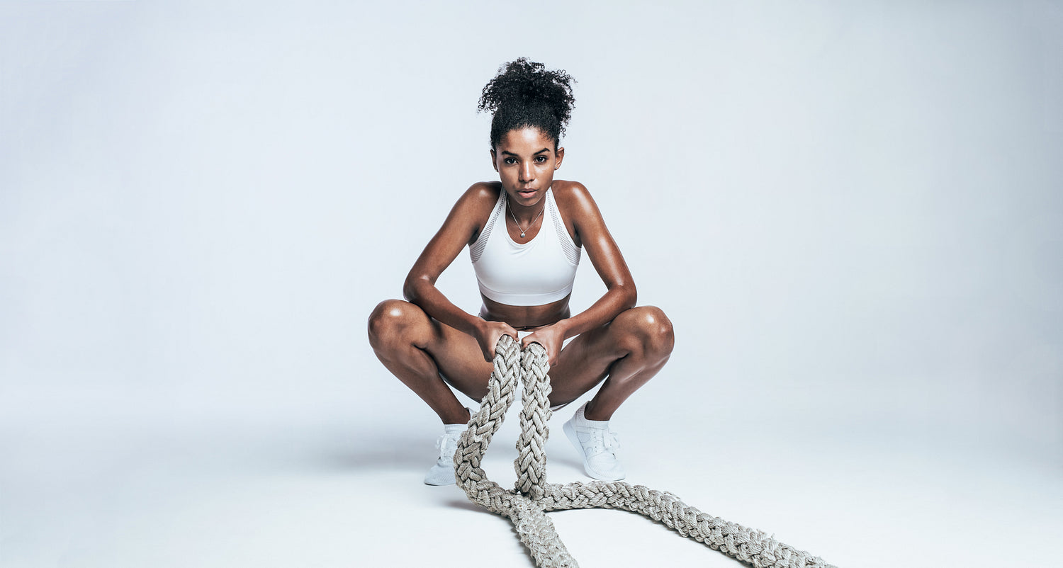 Young woman sitting on floor with battle ropes on white background. Athlete taking rest from intense workout.