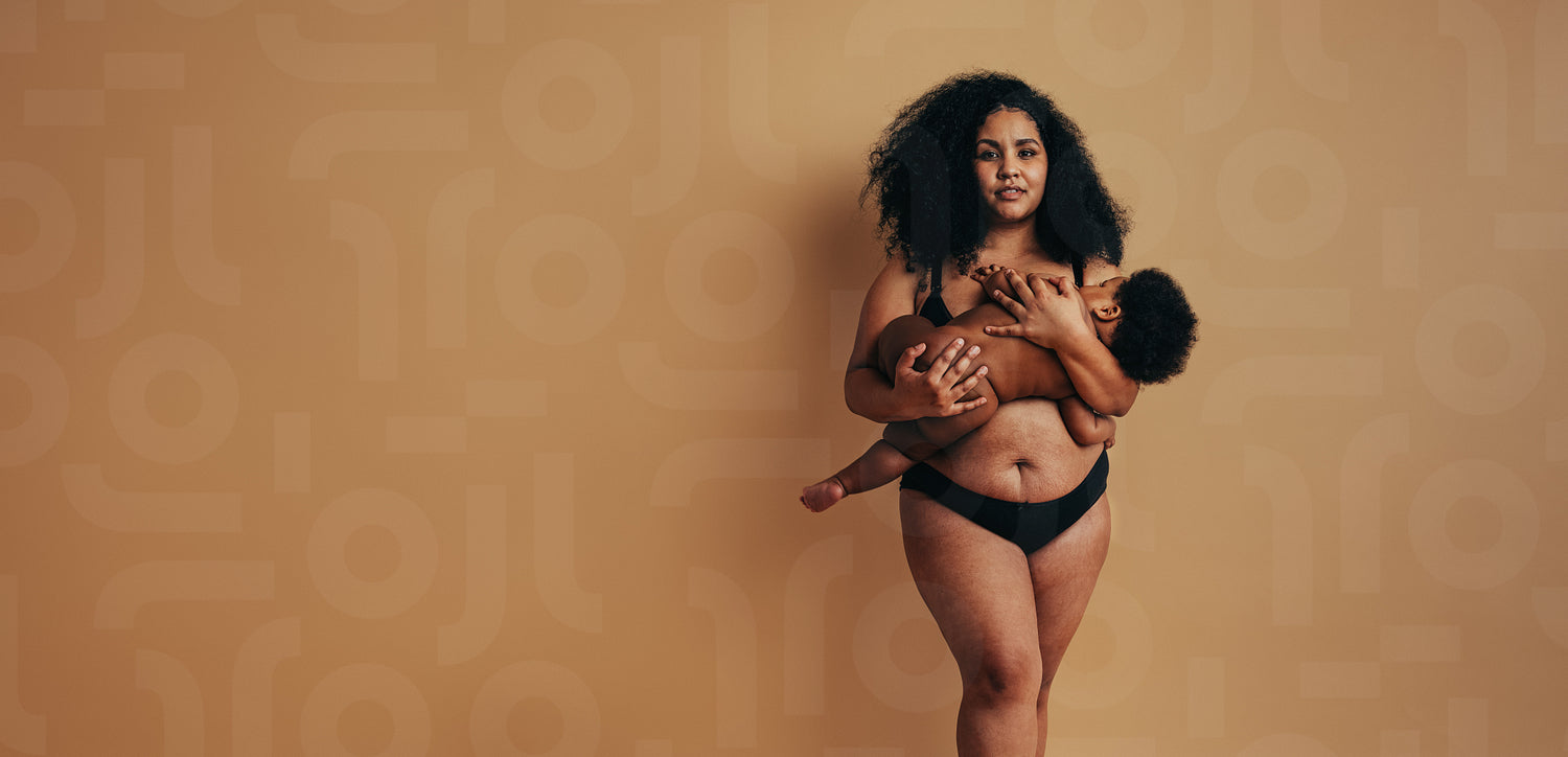 African mother breastfeeding her baby. Postpartum woman and child standing against brown background.
