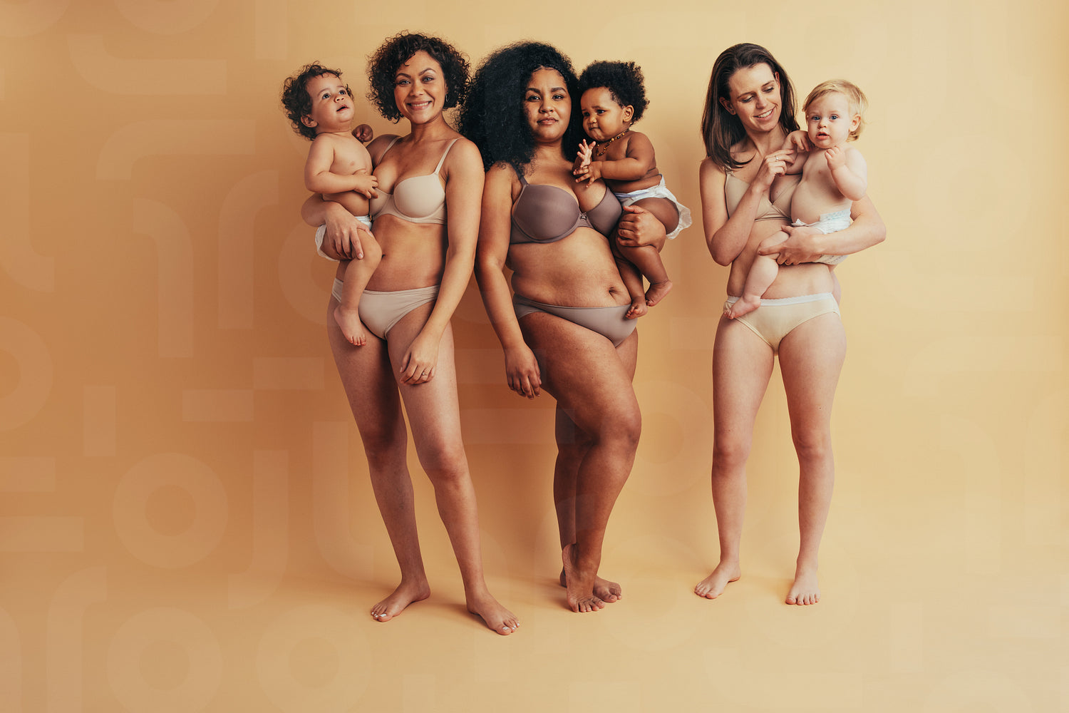 Women with postpartum bodies carrying their children. Full length of group of mothers with babies.
