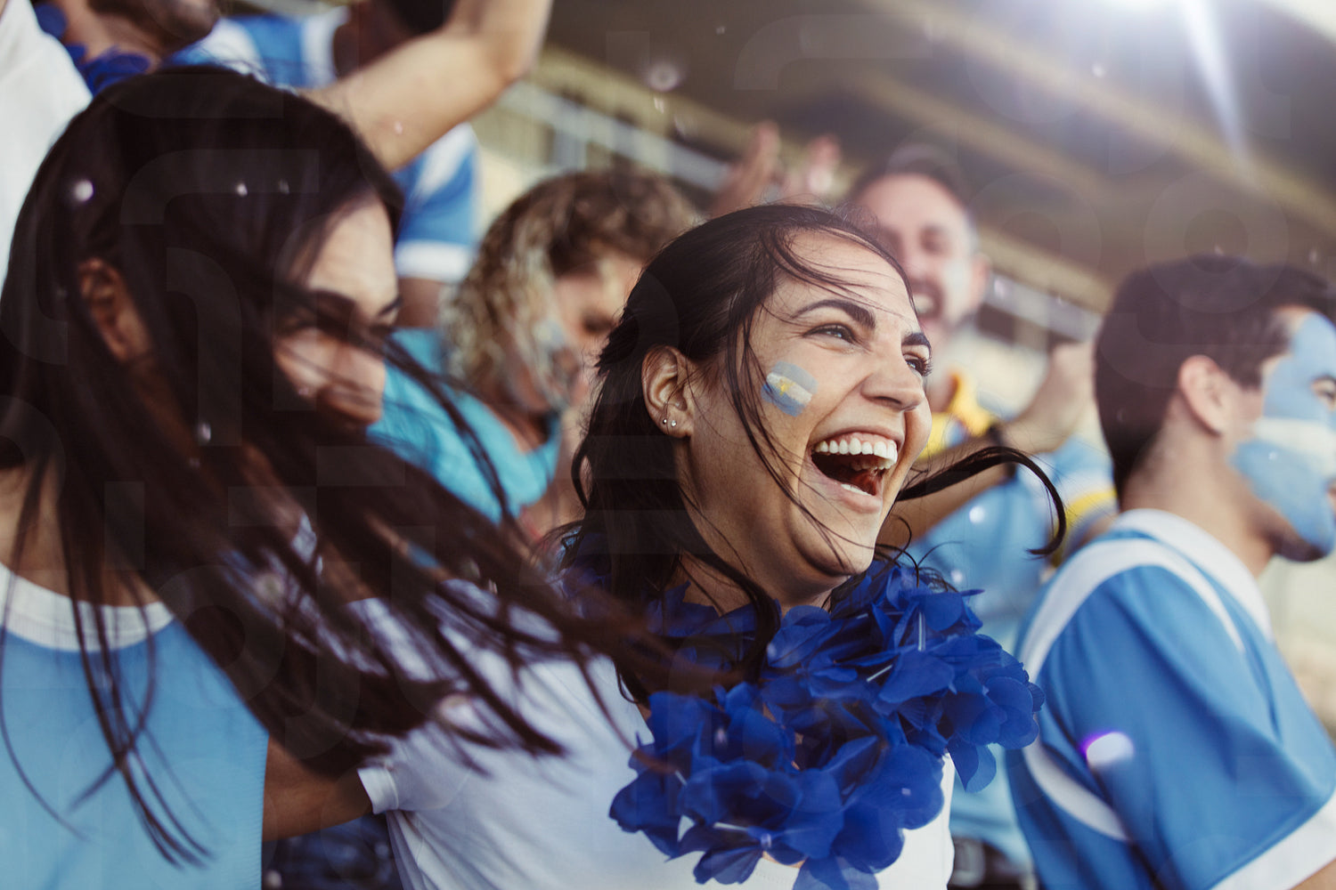 Crowd of sports fans of Argentina cheering during a match in stadium. Group of friends watching sports game celebrating when their team scoring a goal.