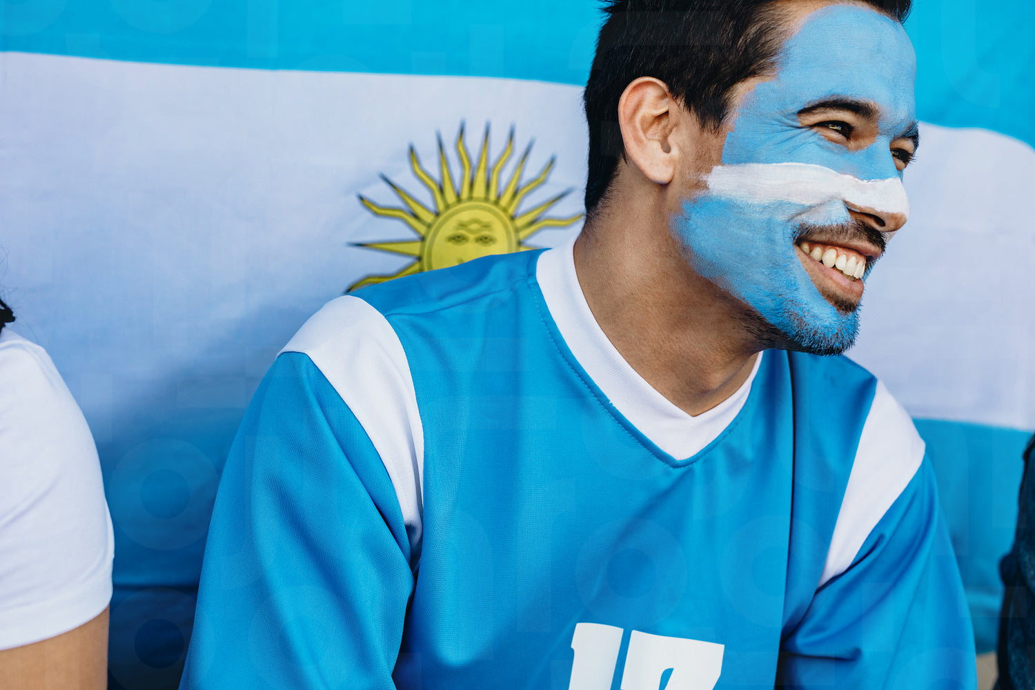 Man sitting in stadium with his face painted in Argentina flag colors. Devoted fan with Argentina flag behind in soccer stadium.