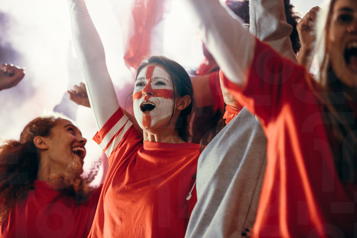England soccer fans watching the match live from the stadium and celebrating a goal. Spectator at stadium cheering when their national team scores a goal.