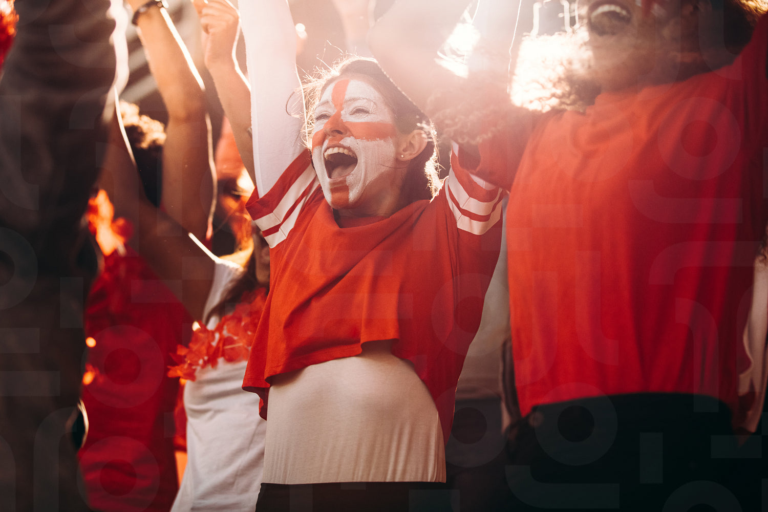 Excited England soccer fans celebrating in stands. English football supporters cheering over a goal in stadium.