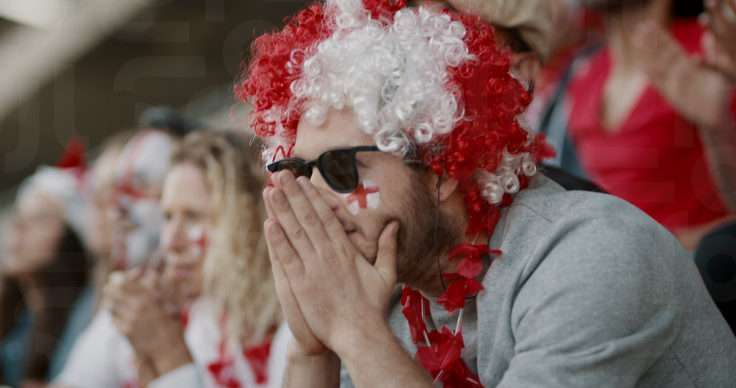 English soccer fans watching the match from the stadium and starts celebrating after their team scoring a goal. Spectator at stadium cheering when their national team scores a goal.