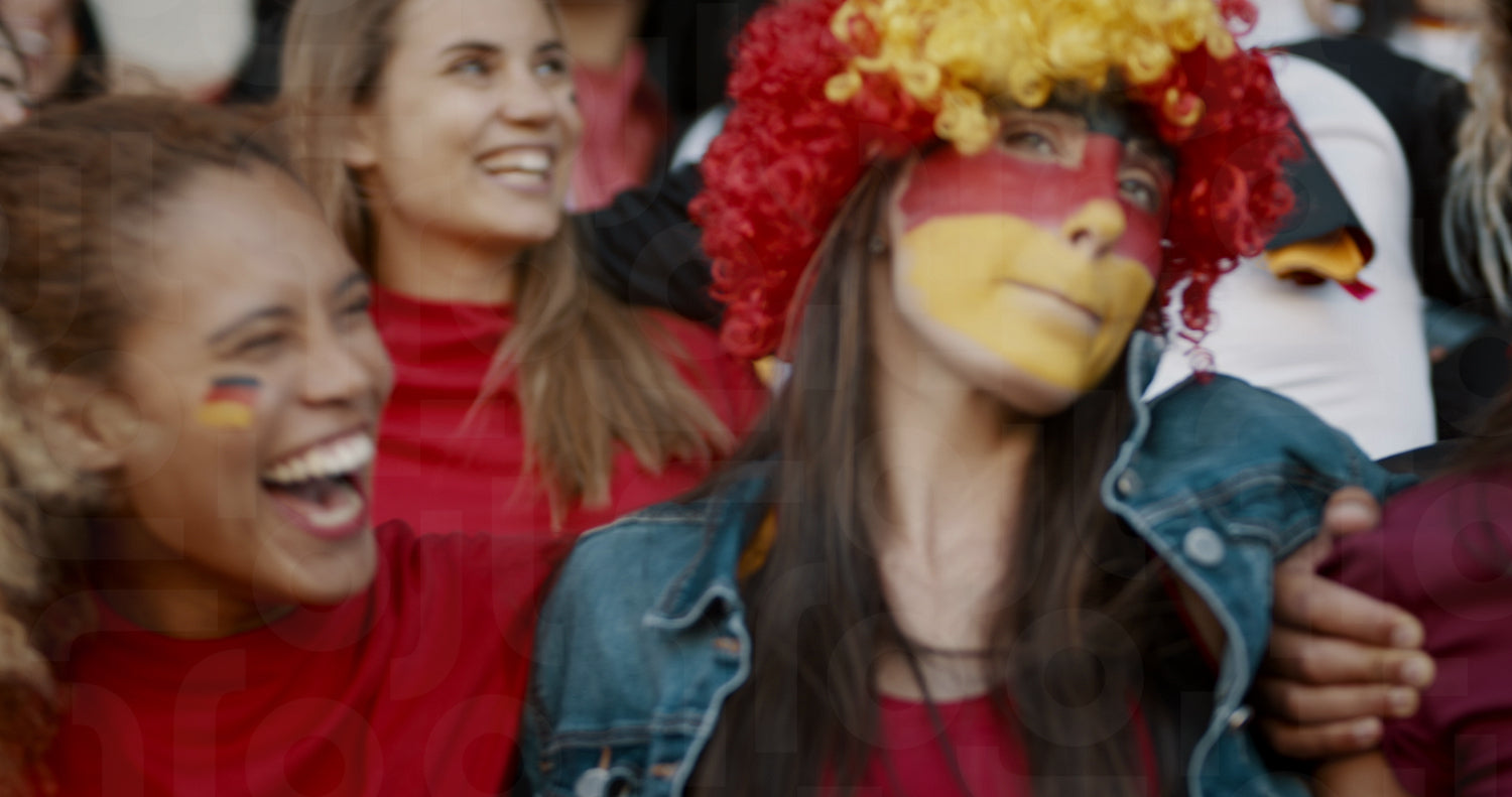 Happy German soccer supporters singing together in stadium. Group of fans with their arms around singing and swinging in fan zone during a live game.