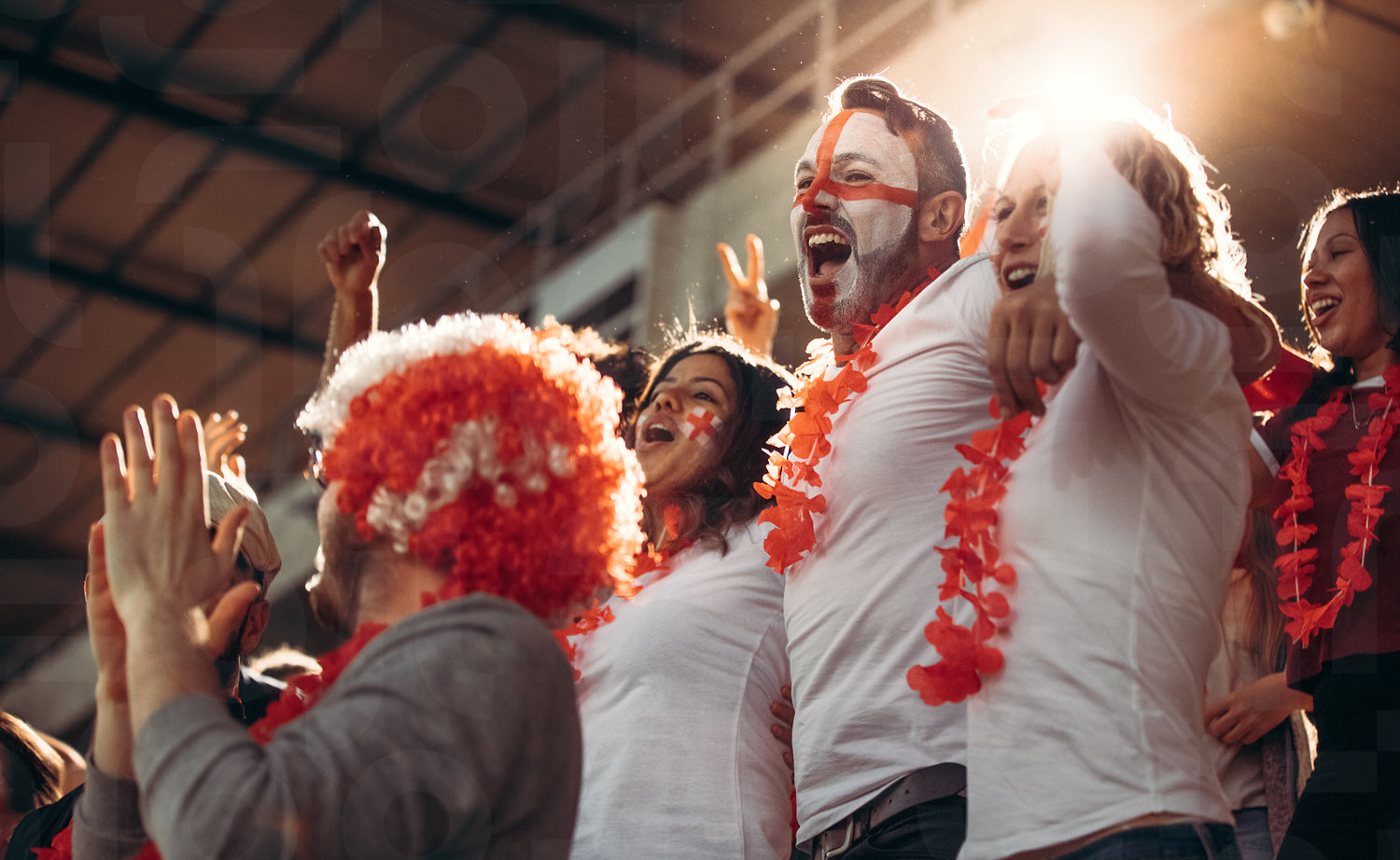 Excited fans with crowd celebrating on team success. Group of England soccer fans cheering in stands.
