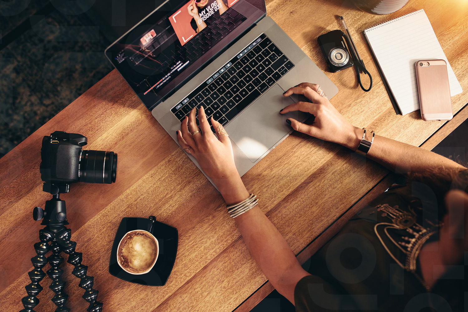Top view of female vlogger editing video on laptop. Young woman working on computer with coffee and cameras on table.