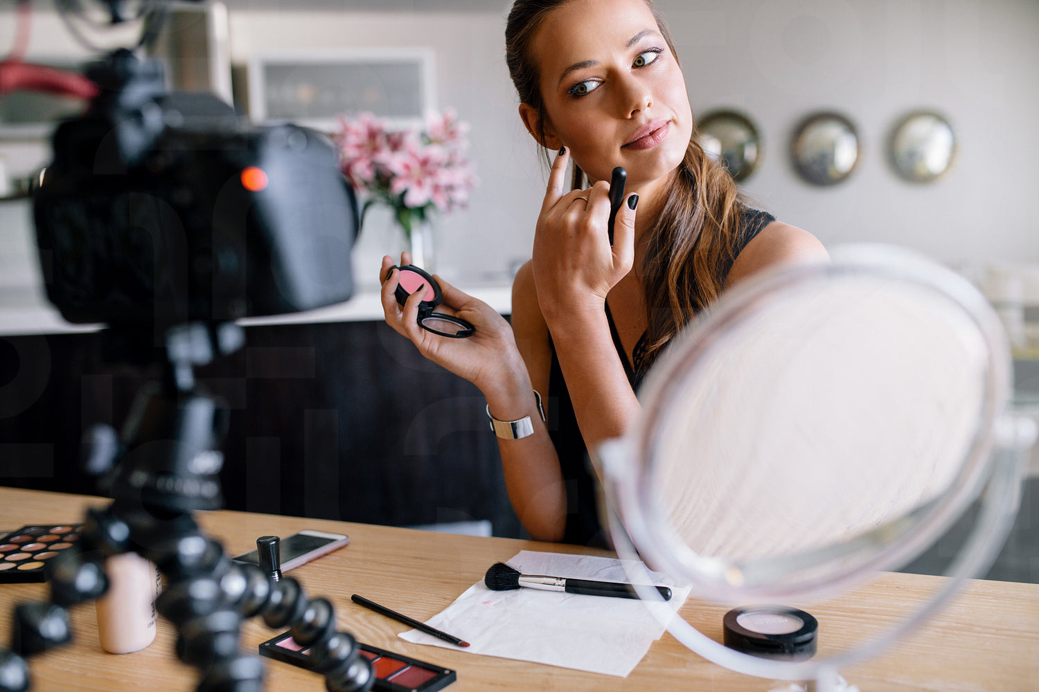 Fashion blogger recording video for her blog on cosmetics. Young woman applying makeup looking into a camera fixed on tripod.