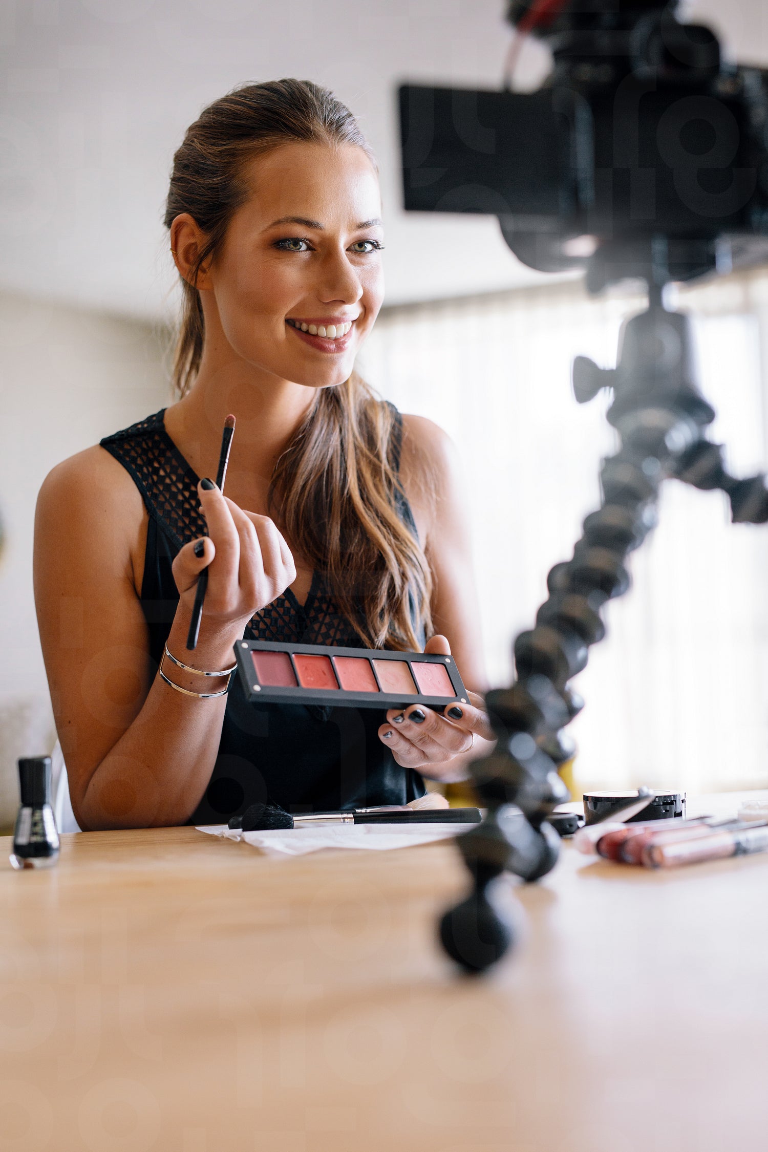 Smiling young lady holding a makeup palette while recording her video. Woman making a video for her blog on cosmetics.