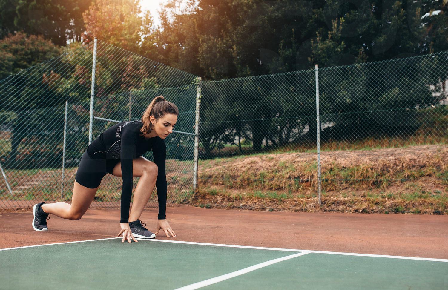 Portrait of a sportswoman stretching outdoors. Beautiful female exercising on tennis court.
